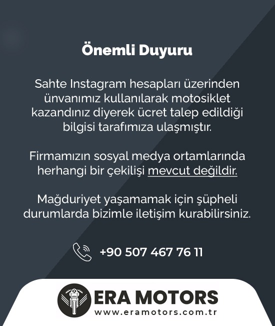 Era Motors deneyimli ekibi ve geniş ürün portföyü ile motosiklet tutkunlarına yönelik hizmet sunmaktadır. Era Motors Çerkezköy'de motosiklet tamiri ve yedek parça tedariği konusundaki ihtiyaçlarınıza yönelik hızlı çözümler üretmektedir. Ayrıca motosiklet ekipmanları ile ilgili sahip olduğu zengin ürün çeşitliliği sayesinde stoktan teslimat gerçekleştirmektedir.